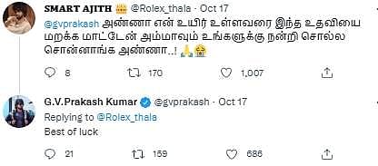 கோயம்புத்தூரைச் சேர்ந்த அஜித் ரசிகர் ஒருவர் தன் அம்மாவின் மருத்துவ செலவுகளுக்கு நிறைய பணம் செலவழிக்க நேரிட்டதாகவும், தற்போது கல்லூரி கட்டணம் செலுத்த பணம் தேவைப்படுவதாகவும் இசையமைப்பாளர் ஜி.வி.பிரகாஷிடம் கோரிக்கைவிடுத்தார்.