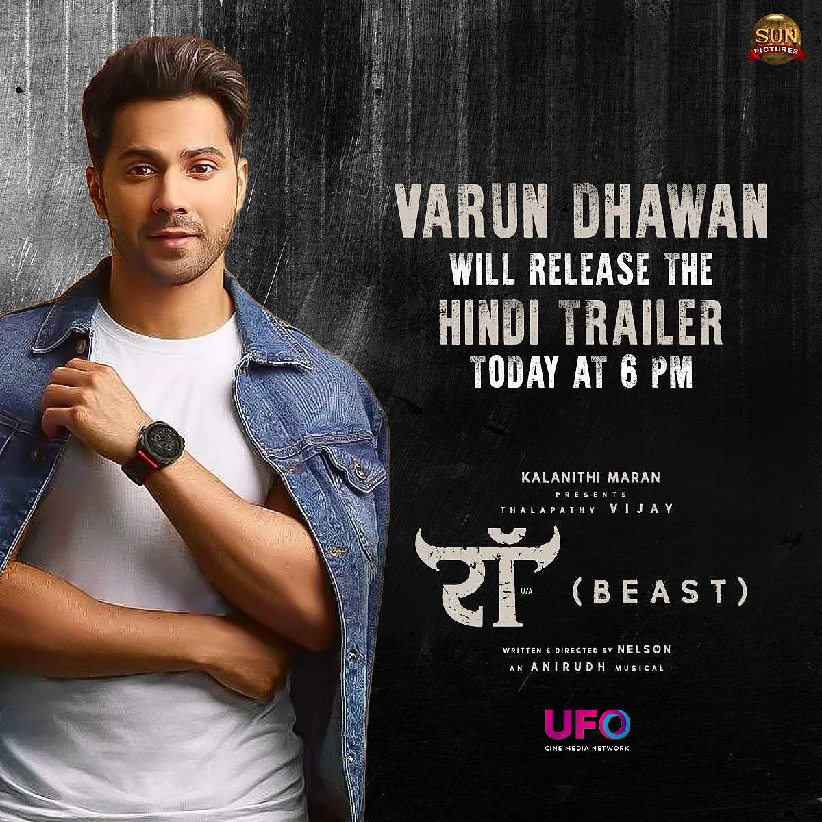 இந்த நிலையில் பீஸ்ட் பட ஹிந்தி டிரெய்லரை ஹிந்தி நடிகர் வருண் தவான் வெளியிடுகிறார். மேலும் இன்று மாலை 4 மணிக்கு அரபிக் குத்து பாடலின் தெலுங்கு மற்றும் ஹிந்தி பதிப்பு வெளியாகவுள்ளது.