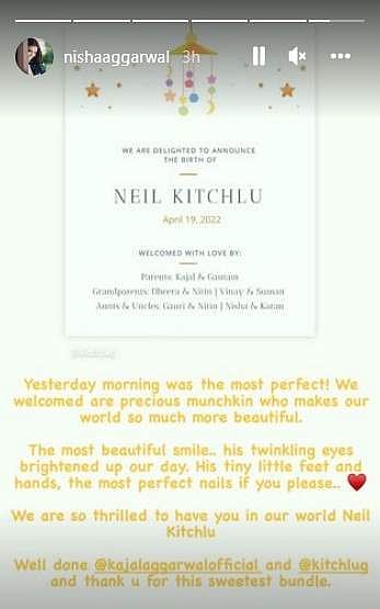 அவரது பதிவில் 'எங்கள் மகனான நீல் கிச்சுலுவின் பிறந்துள்ளதை அறிவிப்பதில் மகிழ்ச்சியடைகிறேன்' என்று குறிப்பிட்டுள்ளார். காஜல் அகர்வாலின் தங்கையும் நடிகையுமான நிஷா, ''நேற்று காலை மிகவும் சிறப்பானதாக இருந்தது. எங்கள் உலகை இன்னும் அழகாக்கும் விலைமிதிப்பற்ற சிறிய உயிரை வரவேற்றோம்.
