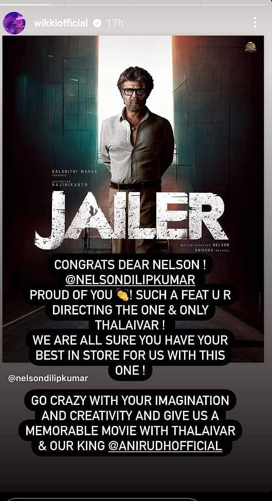 இந்த நிலையில் அவரது நண்பரும் பிரபல இயக்குநருமான விக்னேஷ் சிவன், வாழ்த்துகள் நெல்சன். உன்னை நினைத்து பெருமையாக இருக்கிறது. இது உனது சிறந்த படமாக இருக்கும் என்பதில் நாங்கள் உறுதியாக இருக்கிறோம்.