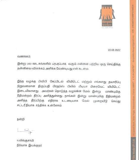 இந்த வழக்கு பிவிபி கேப்பிடல் லிமிடெட் மற்றும் எங்களது தயாரிப்பு நிறுவனமான திருப்பதி பிரதர்ஸ் பிலிம் மீடியா பிரைவேட் லிமிட்டெட் இடையிலானது. அவர்கள் தொடுத்த வழக்கின் மேல் இன்று மாண்புமிகு நீதிமன்றம் தீர்ப்பு அளித்துள்ளது. நாங்கள் இன்று மாண்புமிகு நீதிமன்றம் அளித்த தீர்ப்பிற்கு எதிராக உடனடியாக மேல் முறையீடு செய்து சட்ட ரீதியாக சந்திக்க உள்ளோம் என்று குறிப்பிட்டுள்ளார்.