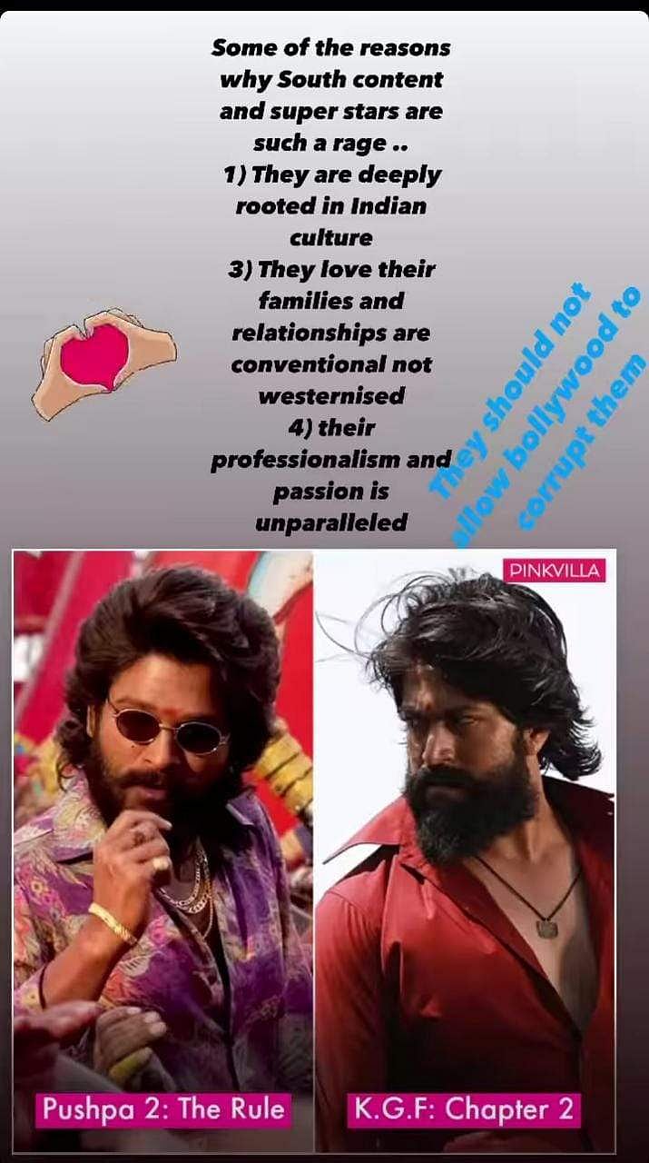 இந்த நிலையில் பாலிவுட் நடிகை கங்கனா ரணாவத் தனது இன்ஸ்டாகிராம் பக்கத்தில் பதிவு ஒன்றை எழுதியுள்ளார். அதில், தென்னிந்திய கதைகள் மற்றும் தென்னிந்திய சூப்பர் ஸ்டார்கள் ஆதிக்கம் செலுத்துகிறார்கள் என்பதற்கு முக்கிய காரணம்