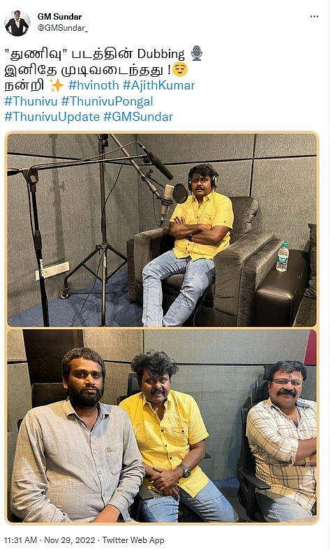 இந்நிலையில், துணிவு படத்தின் டப்பிங் பணிகள் இனிதே முடிவடைந்ததாக நடிகர் ஜி.எம். சுந்தர் டிவிட்டர் பக்கத்தில் பதிவிட்டுள்ளார்.