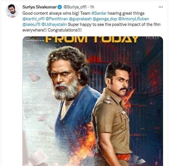 கார்த்தியின் சர்தார் படம் தொடர்பாக சூர்யா பதிவிட்டுள்ளதாவது, ''நல்ல கதை பெரிய வெற்றியைப் பெறும். கார்த்தி, இயக்குநர் மித்ரன், ஜி.வி.பிரகாஷ், ஒளிப்பதிவாளர் ஜார்ஜ் சி.வில்லியம்ஸ், படத்தொகுப்பாளர் ஆண்டனி எல்.ரூபன், உதயநிதி ஸ்டாலின் ஆகியோரின் சர்தார் படம் தொடர்பாக நல்ல விஷயங்களைக் கேள்விப்படுகிறேன். எல்லா இடத்திலும் சர்தார் படத்துக்கு நேர்மறை விமர்சனங்கள் கிடைத்துவருவது எனக்கு மட்டற்ற மகிழ்ச்சியை அளிக்கிறது. வாழ்த்துகள்'' எனக் குறிப்பிட்டுள்ளார்.