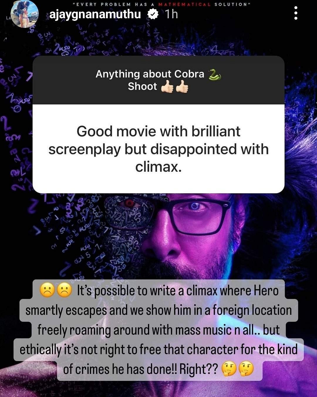 அப்பொழுது ரசிகர் ஒருவர், புத்திசாலித்தனமான திரைக்கதையுடன் கூடிய நல்ல படம் கோப்ரா. ஆனால் முடிவு ஏமாற்றமளித்தது என்று தனது கருத்தினை பதிவு செய்தார்.