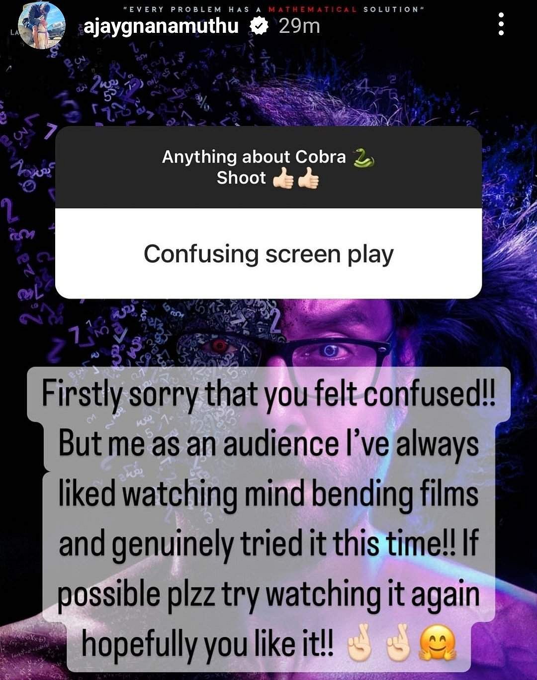 திரைக்கதை குழப்பமாக இருக்கிறது என்ற ரசிகரின் கருத்துக்கு, ''உங்களுக்கு திரைக்கதை குழப்பமாக இருந்ததற்கு என்னை மன்னித்துக்கொள்ளுங்கள். மூளையை கசக்கி பிழியும் வகையிலான படங்கள் எனக்கு பிடிக்கும். இந்த முறை நான் அதனை முயற்சித்தேன். முடிந்தால் இன்னொரு முறை கோப்ரா படம் பாருங்கள். உங்களுக்கு பிடிக்கும் என நம்பிக்கை இருக்கிறது'' என்று குறிப்பிட்டுள்ளார்.