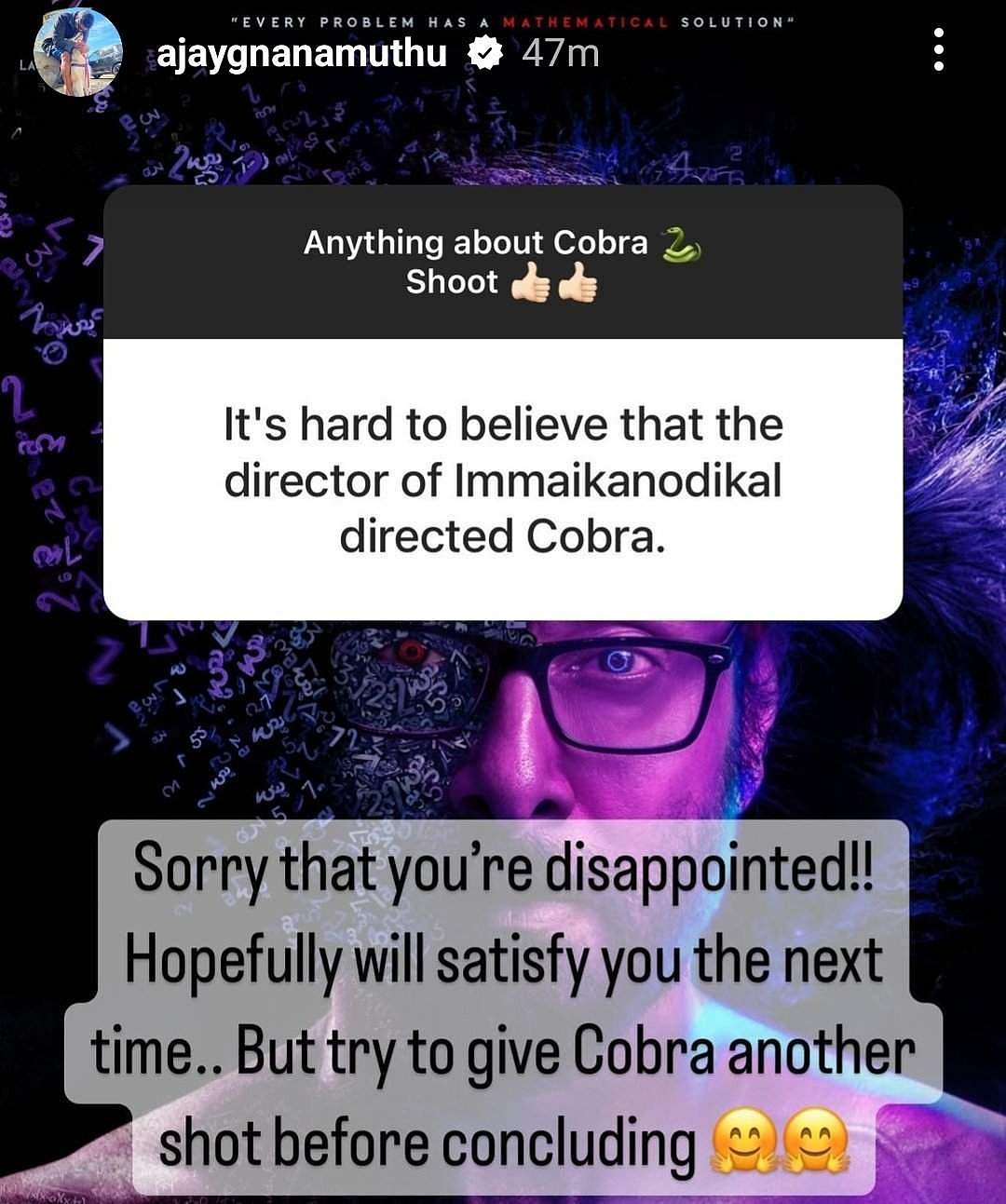 இமைக்கா நொடிகள் படத்தின் இயக்குநர்தான் கோப்ரா படத்தை இயக்கினாரா? என்பதை நம்பமுடியவில்லை என்ற ரசிகரின் கருத்துக்கு, ''நீங்கள் ஏமாற்றமடைந்ததற்கு மன்னித்துக்கொள்ளுங்கள் அடுத்த முறை உங்களை திருப்திப்படுத்துவேன். நீங்கள் ஒரு முடிவுக்கு வருவதற்கு முன் மீண்டும் முயற்சித்துப் பாருங்கள்'' என்று குறிப்பிட்டுள்ளார்.