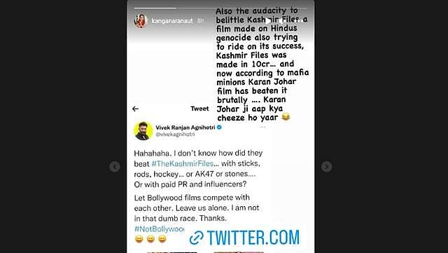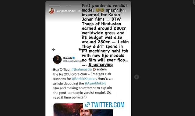 இதனை தனது இன்ஸ்டாகிராம் பக்கத்தில் பகிர்ந்த கங்கனா, “280 கோடி செலவானதாகவும், 280 கோடி உலகம் முழுவதும் வசூலானதாகவும் கூறுவது சிரிப்பாக இருக்கிறது. கரோனாவிற்கு பிறகு உருவாகியுள்ள கரன் ஜோகர் மாடலா இது? எந்த படமும் தோல்வியில்லை என்ற ஒரு மாடலை உருவாக்கப்பார்க்கிறார் போல. 10 கோடியில் உருவாக்கப்பட்ட காஷ்மீர் பைல்ஸ் படத்தை தாண்டியதாக அடாவடித்தனமான வெற்றியாக இருக்கிறதே. காசு கொடுத்து வெற்றிபெற்றதாக தயாரிப்பாளர் கரன் ஜோகர் கூறுவது சிரிப்பாக இருக்கிறதே” என கூறியுள்ளார்.