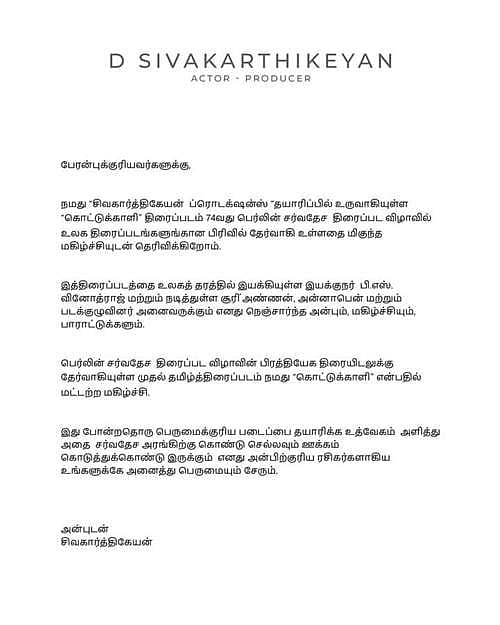 கொட்டுக்காளி திரைப்படம் 74வது பெர்லின் சர்வதேச திரைப்பட விழாவில் உலக திரைப்படங்களுக்கான பிரிவில் தேர்வாகியுள்ளதை நடிகர் சிவகார்த்திகேயன் அறிக்கை வெளியிட்டு அவரது மகிழ்ச்சியை தெரிவித்துள்ளார்.