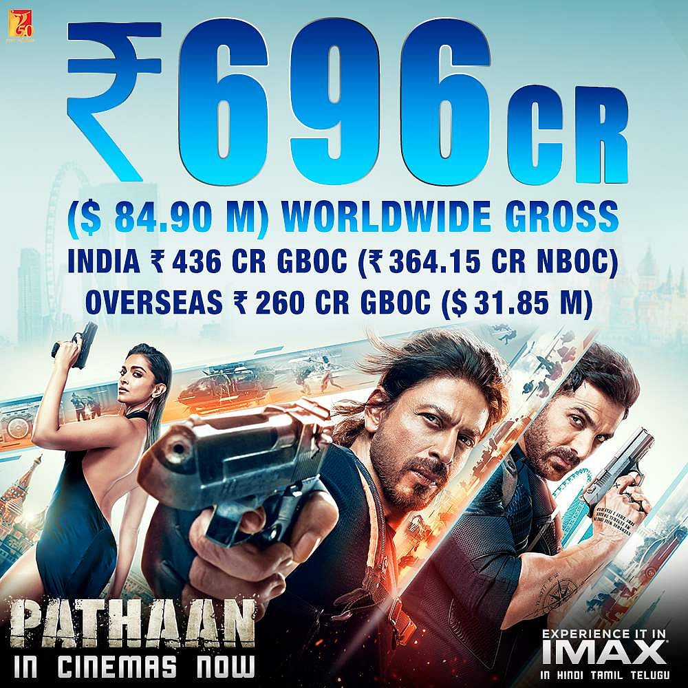 உலகம் முழுவதும் பிப்.3ஆம் தேதி வரை பதான் திரைப்படம் ரூ.696 கோடி வசூலித்திருப்பதாக தயாரிப்பு நிறுவனமான யாஷ்ராஜ் பிலிம்ஸ் அறிவித்திருக்கிறது. இந்தியாவில் ரூ.436 கோடியும், வெளிநாடுகளில் ரூ.260 கோடியும் வசூல் செய்துள்ளதாக தெரிவிக்கப்பட்டுள்ளது.