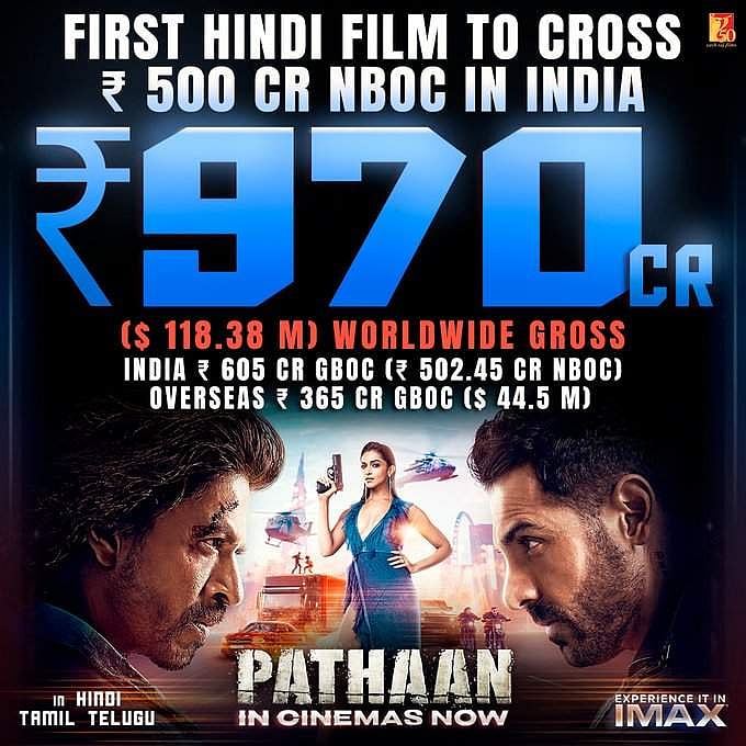 பதான் படம் கடந்த மாதம் இந்தி, தமிழ், தெலுங்கு ஆகிய மொழிகளில் பிரம்மாண்டமாக வெளியானது. ஷாருக் கான், தீபிகா, ஜான் ஆப்ரஹாம் நடிப்பில் உருவாகியுள்ள இந்தப் படம் உலகம் முழுவதும் இதுவரை மொத்தமாக ரூ. 970 கோடி வசூலித்துள்ளது. இந்தியாவில் மட்டும் ரூ. 502 கோடி வசூலித்துள்ளதாகத் தயாரிப்பு நிறுவனம் அறிவித்துள்ளது. இதையடுத்து இந்தியாவில் ரூ. 500 கோடி வசூலைத் தாண்டிய முதல் ஹிந்திப் படம் என்கிற பெருமையைப் பெற்றுள்ளது. இந்தியாவில் இதற்கு முன்பு ரூ. 500 கோடி வசூலைத் தாண்டிய படம் - ராஜமெளலி இயக்கிய பாகுபலி 2.