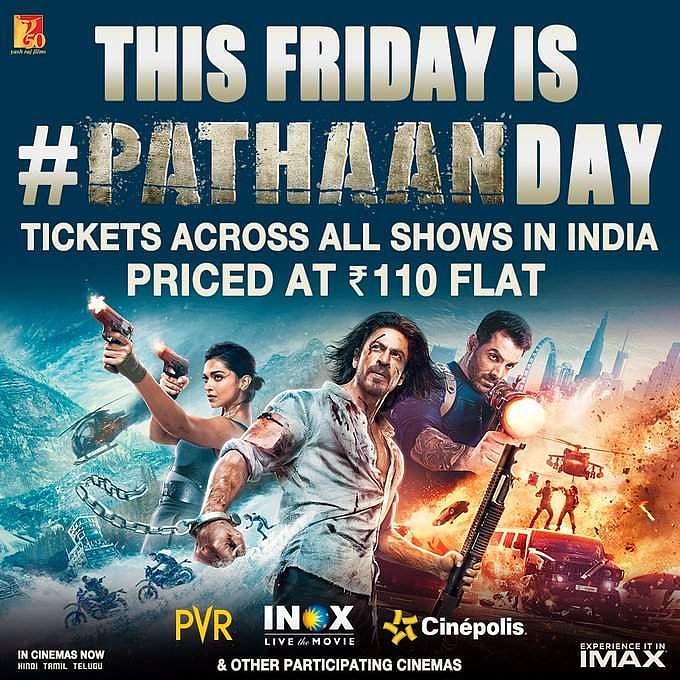 அதன்படி, இந்தியா முழுவதும் சலுகைக் கட்டணமாக மேற்கூறிய திரையரங்குகளில் ரூ. 110 மட்டுமே வசூலிக்கப்படும் என பதான் படத் தயாரிப்பு நிறுவனம் அறிவித்து ரசிகர்களுக்கு இன்ப அதிர்ச்சியை அளித்துள்ளது.