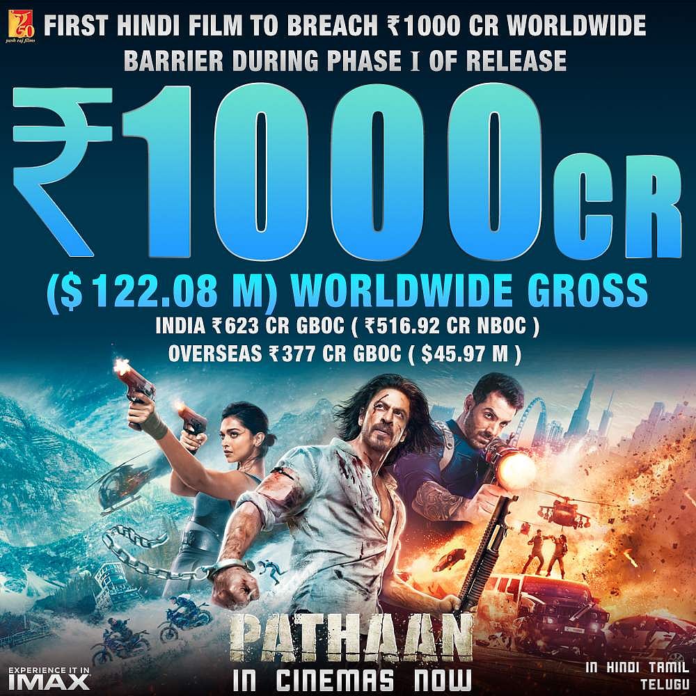 இதுவரை உலகம் முழுவதும் இத்திரைப்படம் ரூ.1,000 கோடியை வசூலித்திருப்பதாக தயாரிப்பு நிறுவனம் அதிகாரப்பூர்வமாக அறிவித்துள்ளது. இதன்மூலம் ஆயிரம் கோடி வசூலித்த முதல் ஹிந்தித் திரைப்படம் என்கிற சாதனையையும் ‘பதான்’ பெற்றுள்ளது.
