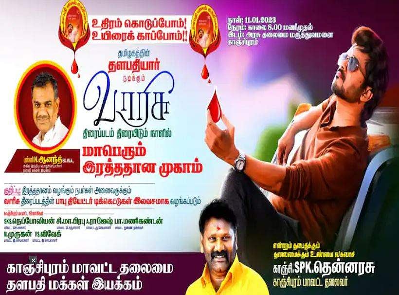 வாரிசு திரைப்படம் வெளியாகும் நாளைய தினம் காஞ்சிபுரம் அரசு மருத்துவமனையில் ரத்த தானம் செய்யும் அனைவருக்கும் வாரிசு படத்திற்கான டிக்கெட் இலவசமாக வழங்கப்படும் என அறிவித்துள்ளனர்.