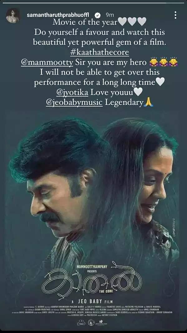 இந்நிலையில்,  நடிகை சமந்தா தனது இன்ஸ்டாகிராம் ஸ்டோரியில், “இந்த ஆண்டின் சிறந்த படம் காதல் தி கோர். அழகான வலுவான இந்தப் படத்தினை நீங்களே பார்த்து உங்களுக்கு நன்மை செய்து கொள்ளுங்கள். மம்மூட்டி சார் நீங்கள்தான் எனது நாயகன். இந்த நடிப்பினை பார்த்துவிட்டு என்னால் நீண்ட நேரம் அதிலிருந்து வெளிவர முடியவில்லை. லவ் யூ ஜோதிகா. ஜியோ பேபி லெஜண்டரி” எனக் குறிப்பிட்டுள்ளார்.