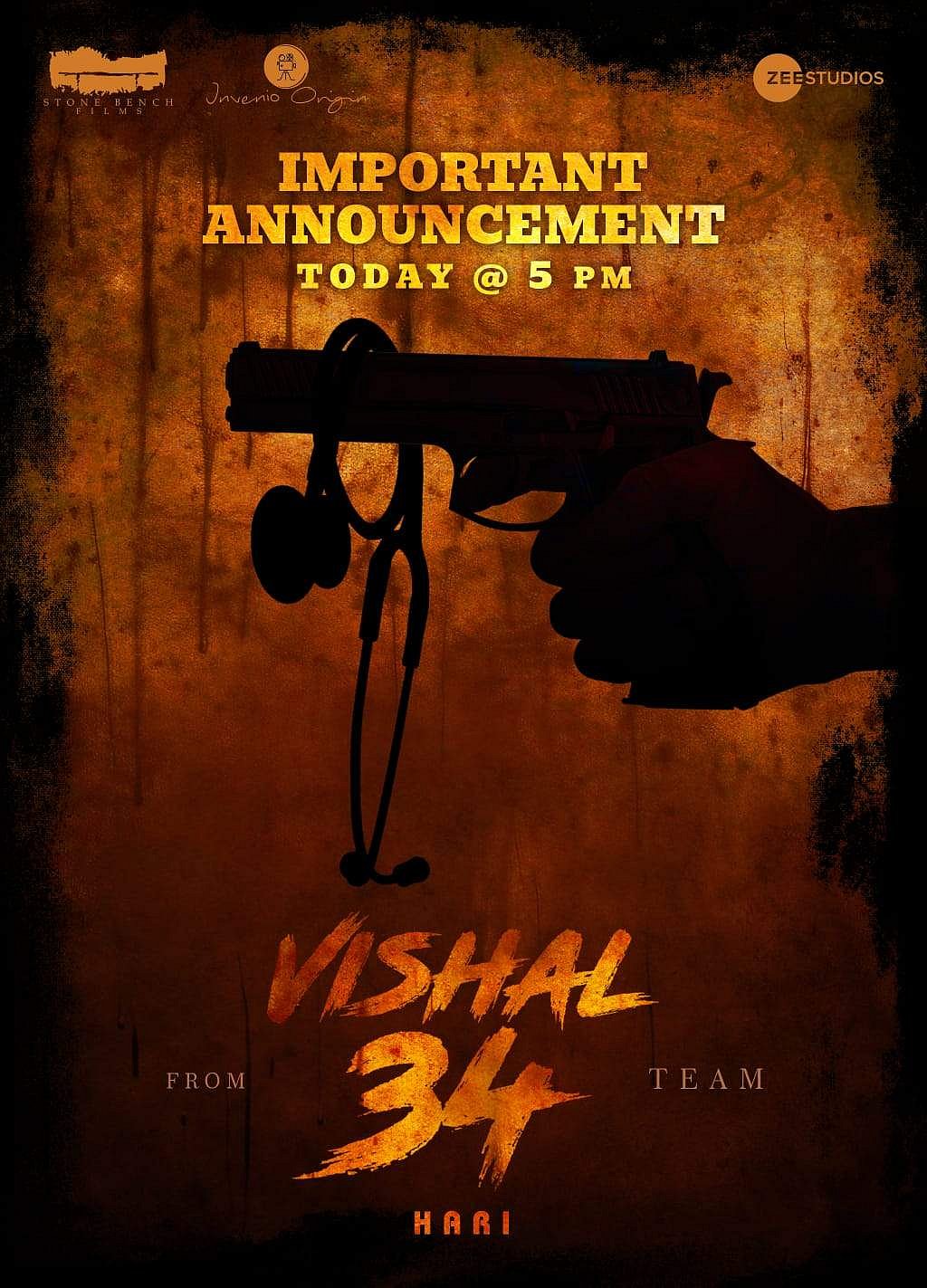 விஷால் 34 படத்தின் முக்கிய அறிவிப்பு இன்று மாலை வெளியிடப்படும் என்று படக்குழு அறிவித்துள்ளது.