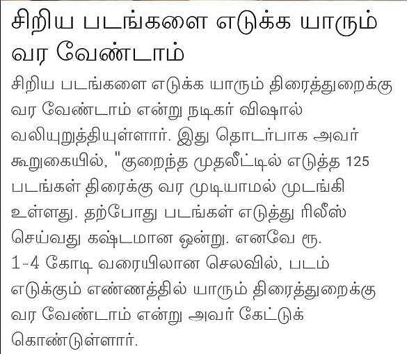 ஆனால், அனைத்தையும் விட விஷால் அறிவுரை சொல்வதாகத்தான் தன் கருத்தைக் கூறியிருக்கிறார். அவர் பேசியதில் சிறிய பட்ஜெட் படங்களை எடுக்க யாரும் முன்வர வேண்டாம் என்கிற அதிகாரக் குரல் இல்லை. அதனால், இது அவருடைய கருத்து என்கிற பக்குவத்திற்குத்தான் விமர்சிப்பவர்கள் வர வேண்டும் என சிலர் ஆதரவும் கொடுத்து வருகின்றனர்!