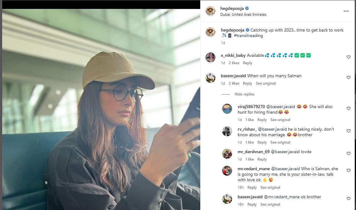 இந்நிலையில், பூஜா ஹெக்டே இன்ஸ்டாகிராம் பக்கத்தில் புகைப்படத்தினை பகிர்ந்து வேலைக்கு கிளம்ப வேண்டும் என பதிவிட்டு இருந்தார். இதில் விஷமத்தனமாக ரசிகர் ஒருவர், “நீங்கள் சல்மான் கானுடன் எப்போது திருமணம் செய்வீர்கள்?” என கமெண்டில் கேள்வி கேட்டுள்ளார்.