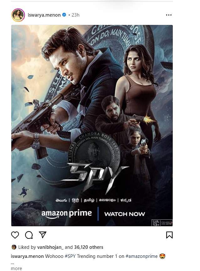 சமீபத்தில் அவர் தெலுங்கு நடிகர் நிகில் சித்தார்த்தாவுடன் நடித்த ஸ்பை எனும் தெலுங்கு திரைப்படம் ஜூன் 29இல் திரையரங்குகளில் வெளியானது. கலவையான விமர்சனங்களை பெற்ற இந்தப்படம் தற்போது அமேசான் ஓடிடி தளத்தில் வெளியாகியுள்ளது. இதில் இந்த வாரத்தில் ஸ்பை படம்தான் முதலிடத்தில் உள்ளதாக நடிகை ஐஸ்வர்யா மேனன் தனது இன்ஸ்டாகிராம் பக்கத்தில் தெரிவித்துள்ளார்.