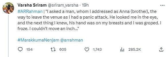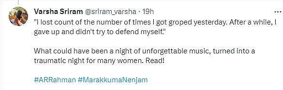 அதில் ஒரு ரசிகை, “நான் அண்ணா என்று ஒருவரை அழைத்து வெளியேறுவதற்கான வழியைக் கேட்டேன். என்னைக் கூர்ந்து கவனித்தவர், திடீரென தன் கைகளை என் மார்பில் வைத்தார். அந்தக் கணத்தில் அப்படியே உறைந்துவிட்டேன். என்னால் ஒரு அங்குலம் கூட நகரமுடியவில்லை. பலமுறை இந்த மாதிரியான சம்பவம் நடந்தது.’ எனப் பதிவிட்டுள்ளார்.