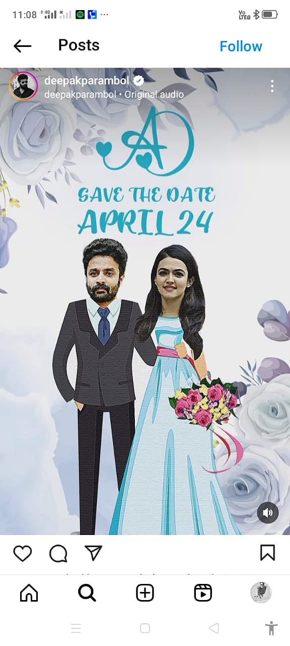 இந்நிலையில், இவருக்கும் மஞ்ஞுமல் பாய்ஸ் படத்தில் நடித்த நடிகர் தீபக் பரம்பொலுக்கும் ஏப்.24 ஆம் தேதி திருமணம் நடைபெற உள்ளதாக அதிகாரப்பூர்வமாக அறிவித்துள்ளனர்.