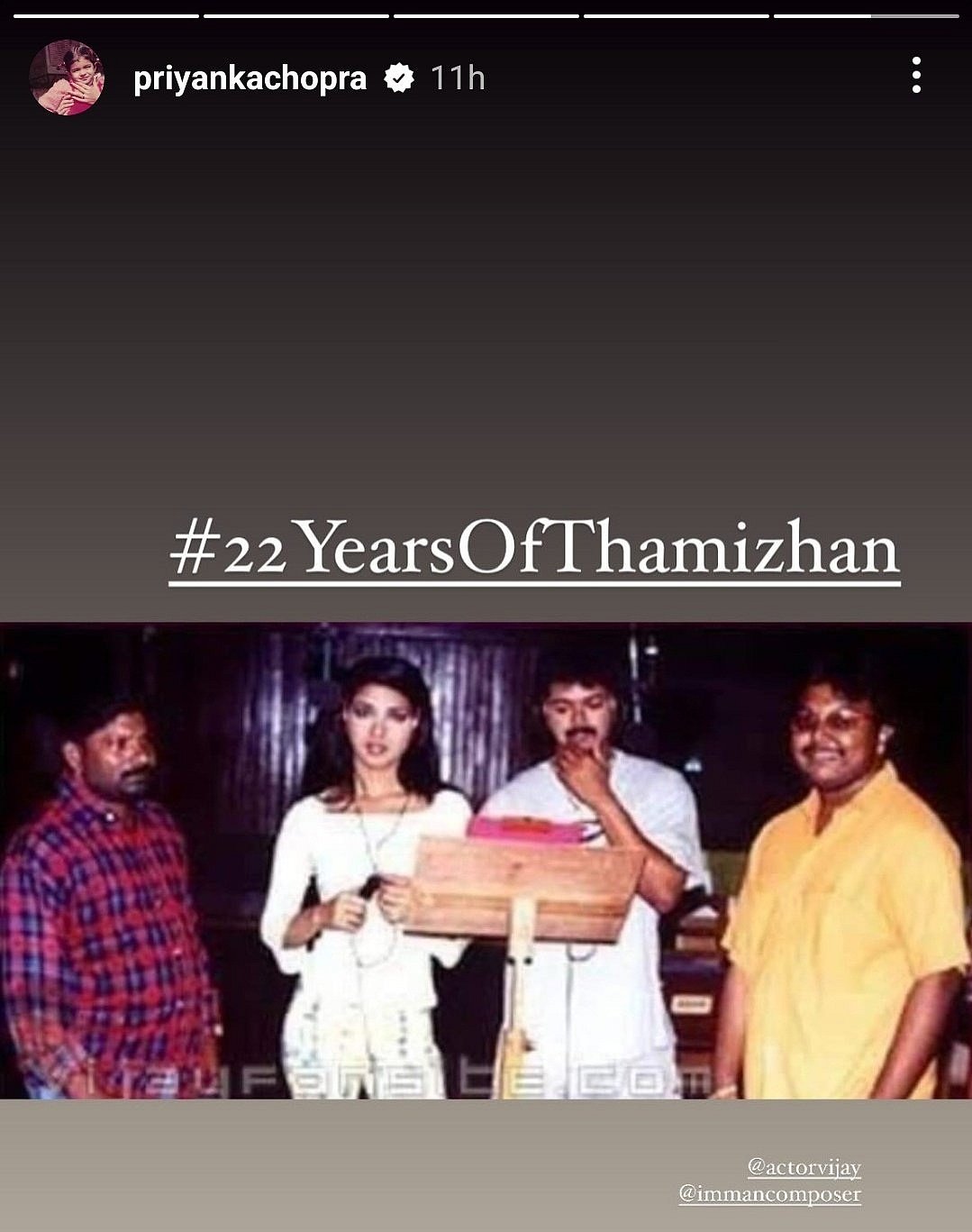 இந்நிலையில் தனது இன்ஸ்டாகிராம் ஸ்டோரியில் தமிழன் படப்பிடிப்பில் நடிகர் விஜய், இசையமைப்பாளர் டி.இமான் உடன் எடுத்த புகைப்படத்தினை பகிர்ந்துள்ளார். தமிழன் திரைப்படம் வெளியாகி 22 ஆண்டுகள் ஆனதாக அதில் பதிவிட்டுள்ளார்.