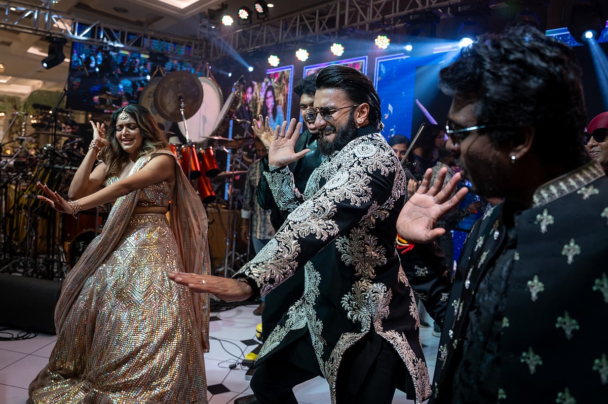 டிரம்ஸ் சிவமணியின் வாசிக்க, ரன்வீர் சிங் மேடையில் நடனமாடி அனைவரையும் மகிழ்வித்தார். அவருடன், மணமக்கள், ஷங்கரின் இரண்டாவது மகளும் நடிகையுமான அதிதி, இயக்குநர் அட்லி உள்ளிட்டோரும் நடனமாடினர்.