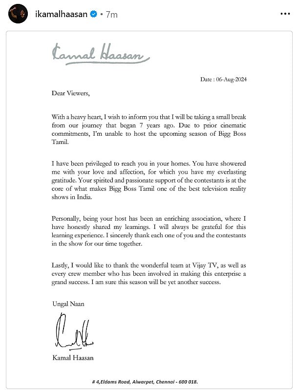 இந்த நிலையில், தொகுப்பாளராக கடந்த 7 ஆண்டுகளாக பொறுப்பு வகித்த பிக்பாஸ் நிகழ்ச்சியிலிருந்து விலகுவதாக கமல்ஹாசன் அறிவித்துள்ளார்.