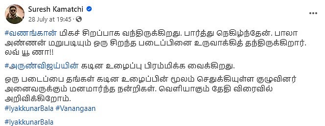 இந்த நிலையில், வணங்கான் படத்தைப் பார்த்த தயாரிப்பாளர் சுரேஷ் காமாட்சி படம் நன்றாக வந்திருப்பதாகக் கூறியிருந்தார். மேலும், வணங்கான் திரைப்படம் பொதுவெளியில் பேசப்படும் படமாக இருக்கும் என்கிற நம்பிக்கையில் படக்குழுவினர் இருப்பதாகத் தகவல்.