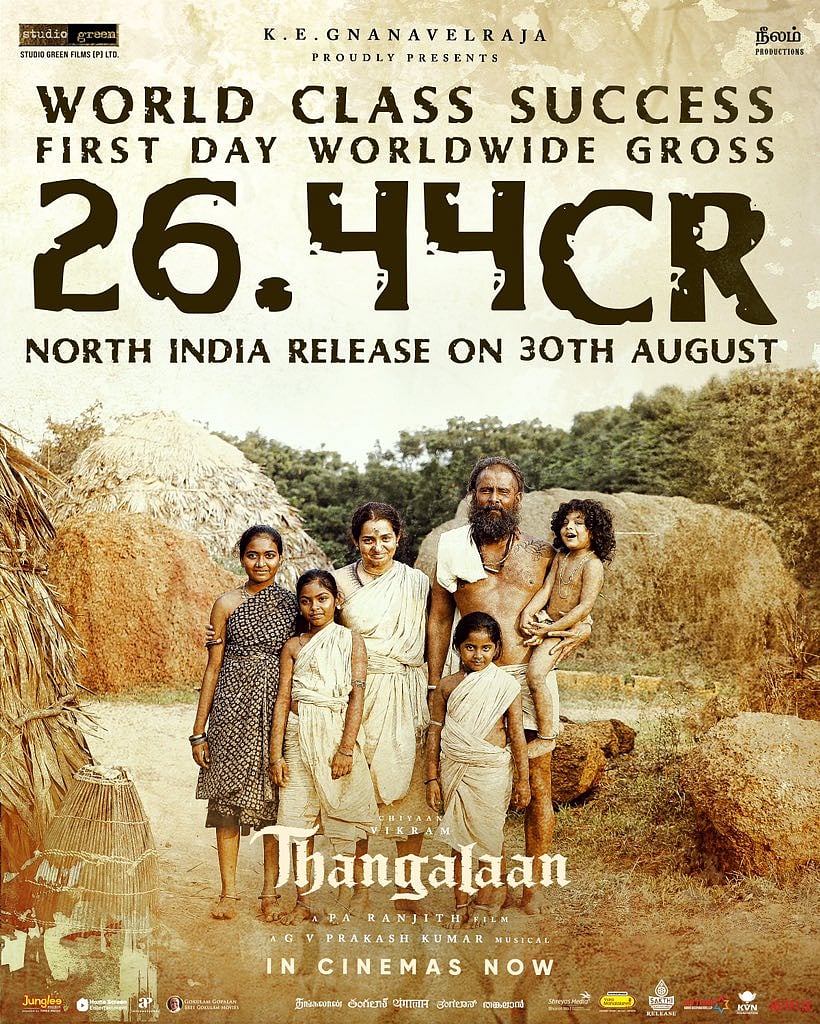 கலவையான விமர்சனங்களைப் பெறும் தங்கலான் முதல்நாளில் உலகம் முழுவதும் ரூ. 26. 44 கோடி வசூலித்துள்ளதாக படக்குழு அதிகாரபூர்வமாக தெரிவித்துள்ளது.