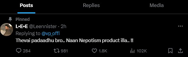 இதற்கு பதிலளித்த இயக்குநர் வெங்கட் பிரபு, “நன்றி சகோதரர். உங்களது அப்பா பெயரை சொல்லிடுங்க அவருக்கும் நன்றி சொல்லிவிடுகிறேன்” எனக் கூற, அதற்கு அந்த அஜித் ரசிகர், “தேவையில்லை சகோதரர். நான் வாரிசு அரசியலில் வந்தவன அல்ல” எனக் குறிப்பிட்டுள்ளார்.