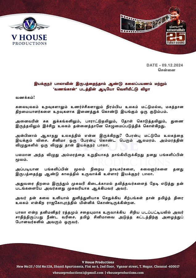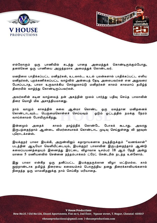 இதுகுறித்து வி ஹவுஸ் புரடக்ஷன்ஸ் வெளியிட்ட அறிக்கையில், “இயக்குநர் பாலாவின் 25 ஆம் ஆண்டு கலைப்பயணம் மற்றும் ‘வணங்கான்’ படத்தின் இசை வெளியீட்டு விழா டிசம்பர் 18 ஆம் தேதி அன்று மாலை 5 மணியளவில் சென்னை நந்தம்பாக்கம் ட்ரேட் சென்டரில் நடத்த உள்ளோம்.” என்பதைக் குறிப்பிட்டுள்ளது.