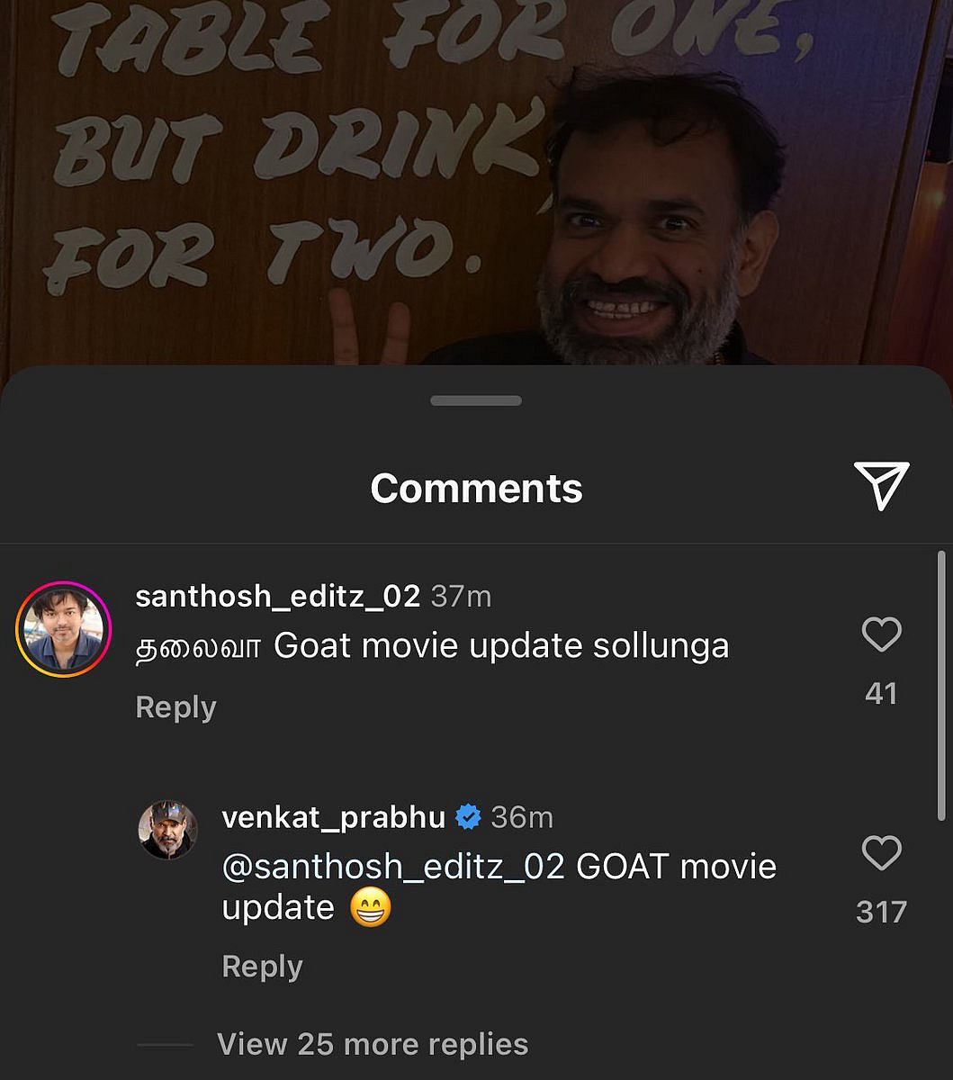 இந்நிலையில், ரசிகர் ஒருவர் இயக்குநர் வெங்கட் பிரபுவிடம் கோட் படத்தின் அப்டேட் சொல்லுங்கள் எனக் கேட்டிருந்தார். அதற்கு, வெங்கட் பிரபு “கோட் படத்தின் அப்டேட்” என அவர் கேட்டதையே கூறி கிண்டலடித்துள்ளார்.