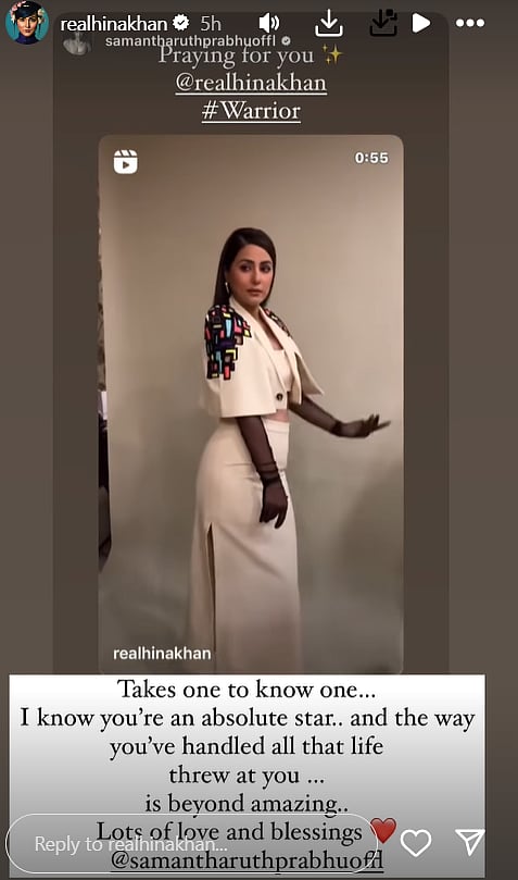 இந்த நிலையில், நடிகை சமந்தா தன் இன்ஸ்டாகிராம் பக்கத்தில் ஹினா கான் பதிவிட்ட விடியோயைப் பகிர்ந்து, "உங்களுக்காக பிராத்திக்கிறேன் ஹினா கான்” எனக் கூறியதுடன் ‘போராளி (வாரியர்)’ என்றும் குறிப்பிட்டுள்ளார்.