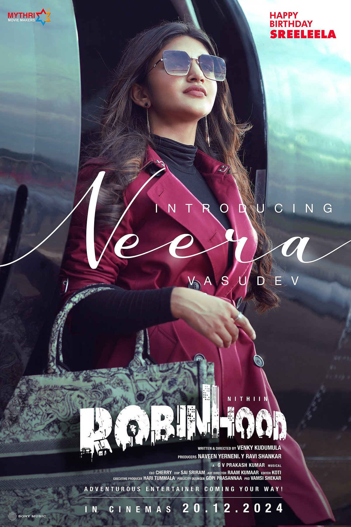 இந்நிலையில் 23-ஆவது பிறந்தநாளைக் கொண்டாடும் ஸ்ரீ லீலாவுக்கு மைத்ரி மூவி மேக்கர்ஸ் தயாரிப்பில் நிதின் உடன் ராபின்ஹுட் படத்தில் நடிக்கிறார். இதில் ஸ்ரீ லீலாவின் கதாபாத்திரம் அறிமுகம் செய்யப்பட்டுள்ளது.