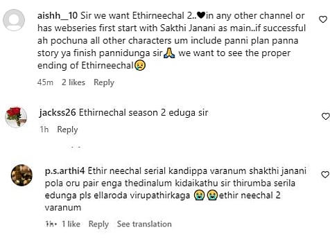 இந்தப் பதிவில் எதிர்நீச்சல் -2 குறித்து ரசிகர்கள் ஆர்வமுடன் கேள்வி எழுப்பி வருகின்றனர். சக்தி - ஜனனி பாத்திரங்களை மட்டுமாவது வைத்து இரண்டாம் பாகத்தை எடுக்குமாறு ரசிகர்கள் கோரிக்கை விடுத்து வருகின்றனர்.