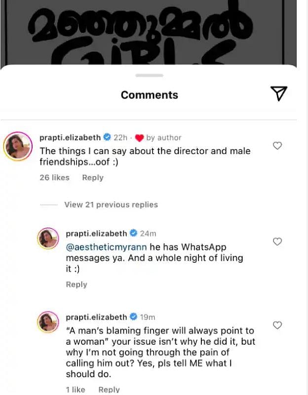 மஞ்ஞுமல் பாய்ஸ் இயக்குநர் சிதம்பரம் பாலியல் தொல்லை அளித்ததாக நடிகை குற்றம் சாட்டியுள்ளார்.