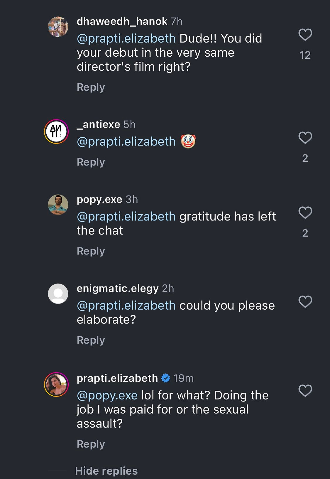 இச்சூழலில், சிதம்பரம் இயக்கிய முதல் படமான, ‘ஜான். ஈ. மேன்’ திரைப்படத்தில் நடித்த நடிகை பிராப்தி எலிசபெத் தன் இன்ஸ்டாகிராம் பக்கத்தில், “இயக்குநர் சிதம்பரம் ஜான். ஈ. மேன் படத்தில் நடித்தபோது என்னிடம் அத்துமீறி நடந்துகொண்டார் என்றும் வாட்ஸ்ஆப்பில் ஒரு குழுவையே ஆரம்பித்து குறுஞ்செய்திகளை அனுப்புவார் என்றும் பதிவிட்டுள்ளார். இன்னொரு காமெண்டில், “எனக்கு சம்பளம் கொடுத்தது என் வேலைக்காகவா அல்லது பாலியல் சீண்டலுக்காகவா” எனக் கேட்டுள்ளார்.