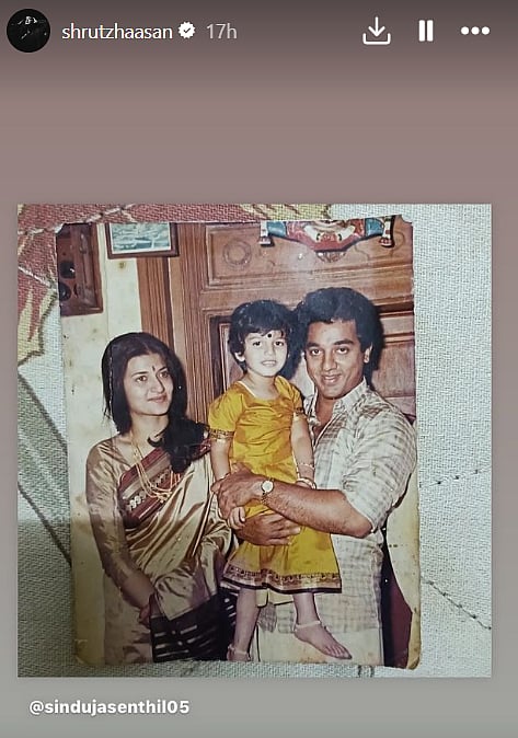 இந்த நிலையில், இன்ஸ்டாகிராமில் ரசிகை ஒருவர், தன் தந்தையின் அறையிலிருந்து எடுத்ததாக நடிகை ஸ்ருதி ஹாசனின் சிறுவயது புகைப்படத்தைப் பதிவிட்டார். அதில், சிறுமி ஸ்ருதி தன் தந்தை கமல்ஹாசன் மற்றும் தாய் சரிகாவுடன் இருக்கிறார்.