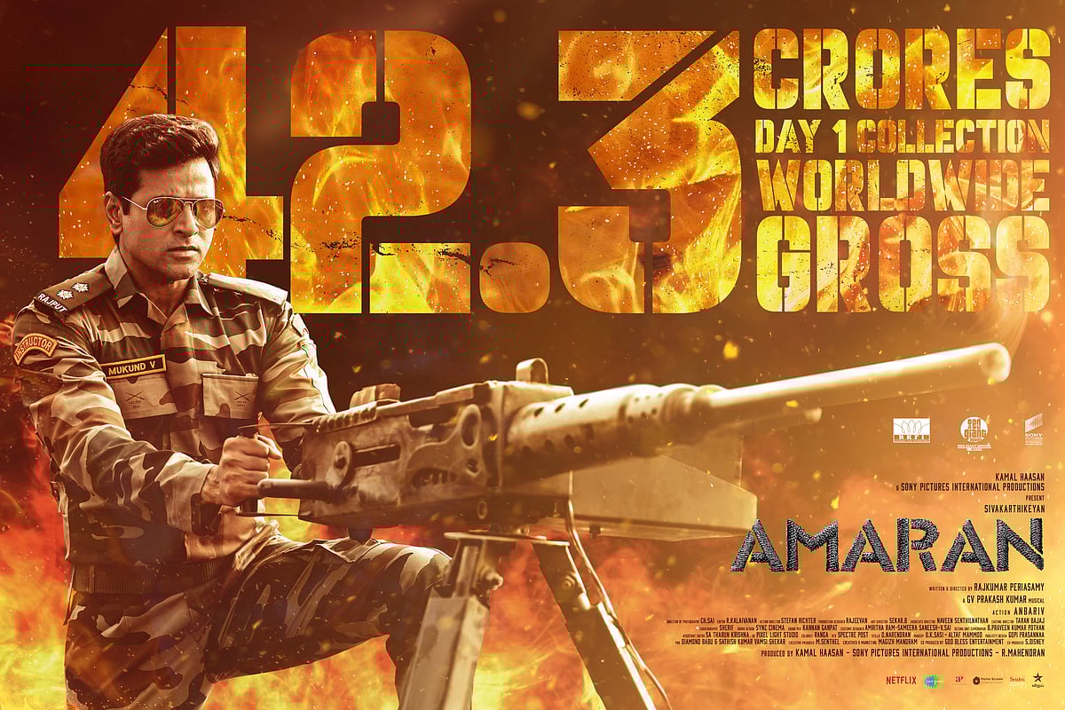 இந்த நிலையில், அமரன் திரைப்படம் உலகளவில் முதல் நாளில் ரூ.42.3 கோடியை வசூலித்துள்ளதாகத் தயாரிப்பு நிறுவனம் அதிகாரப்பூர்வமாக அறிவித்துள்ளது.