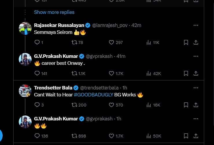 இந்த நிலையில், ரசிகர் ஒருவர் குட் பேட் அக்லிக்கு சிறப்பாக இசையமைக்க வேண்டும் என வேண்டுகோள் வைத்ததற்கு, ஜிவி பிரகாஷ், “என் தொழிலில் இதுவே சிறப்பானதாக இருக்கும்” என பதிலளித்துள்ளார். இதனால், குட் பேட் அக்லிக்கு ஜி. வி. பிரகாஷ் இசையமைப்பது உறுதியாகியுள்ளது.