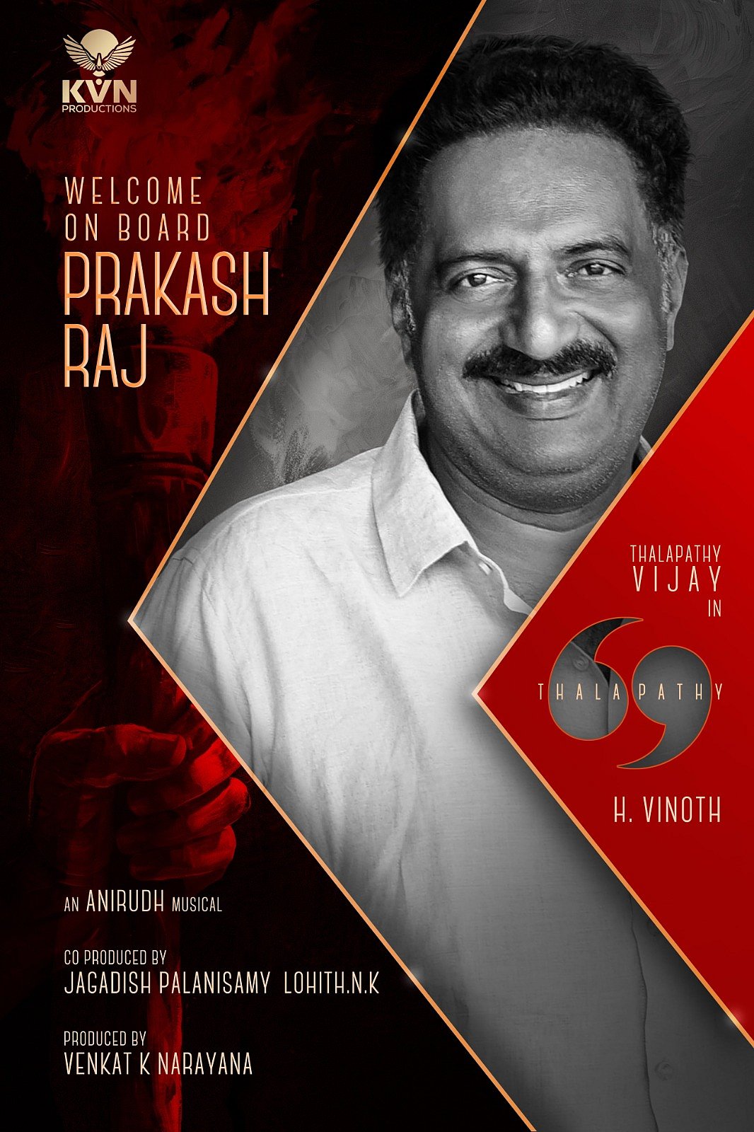 விஜய் 69 படத்தில் நடிகர் பிரகாஷ் ராஜ் இணைந்துள்ளதாக தயாரிப்பு நிறுவனம் அதிகாரப்பூர்வமாக அறிவித்துள்ளது.