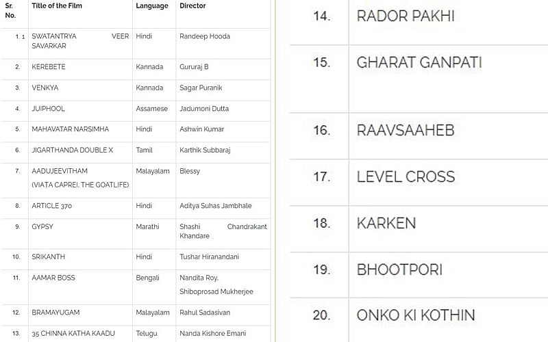 வணிக சினிமா பிரிவில் 12த் பெயில், மஞ்சுமெல் பாய்ஸ், கல்கி 2898 ஏடி, ஸ்வார்கரத், கர்கானு ஆகிய படங்களும் தேர்வாகியுள்ளன.