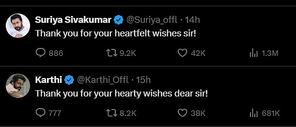 பவன் கல்யாணின் பதிவுக்கு நடிகர்கள் சூர்யா மற்றும் கார்த்தி நன்றி தெரிவித்துள்ளனர்.