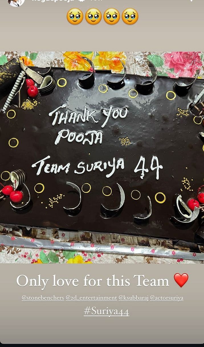 இந்நிலையில், தனது இன்ஸ்டா ஸ்டோரியில் தனக்கான படப்பிடிப்பு முடிவடைந்ததை பூஜா ஹெக்டே அறிவித்துள்ளார். இதற்காக படக்குழு கேக் வெட்டி கொண்டாடியுள்ளதை கண்ணீருடன் பகிர்ந்துள்ளார்.