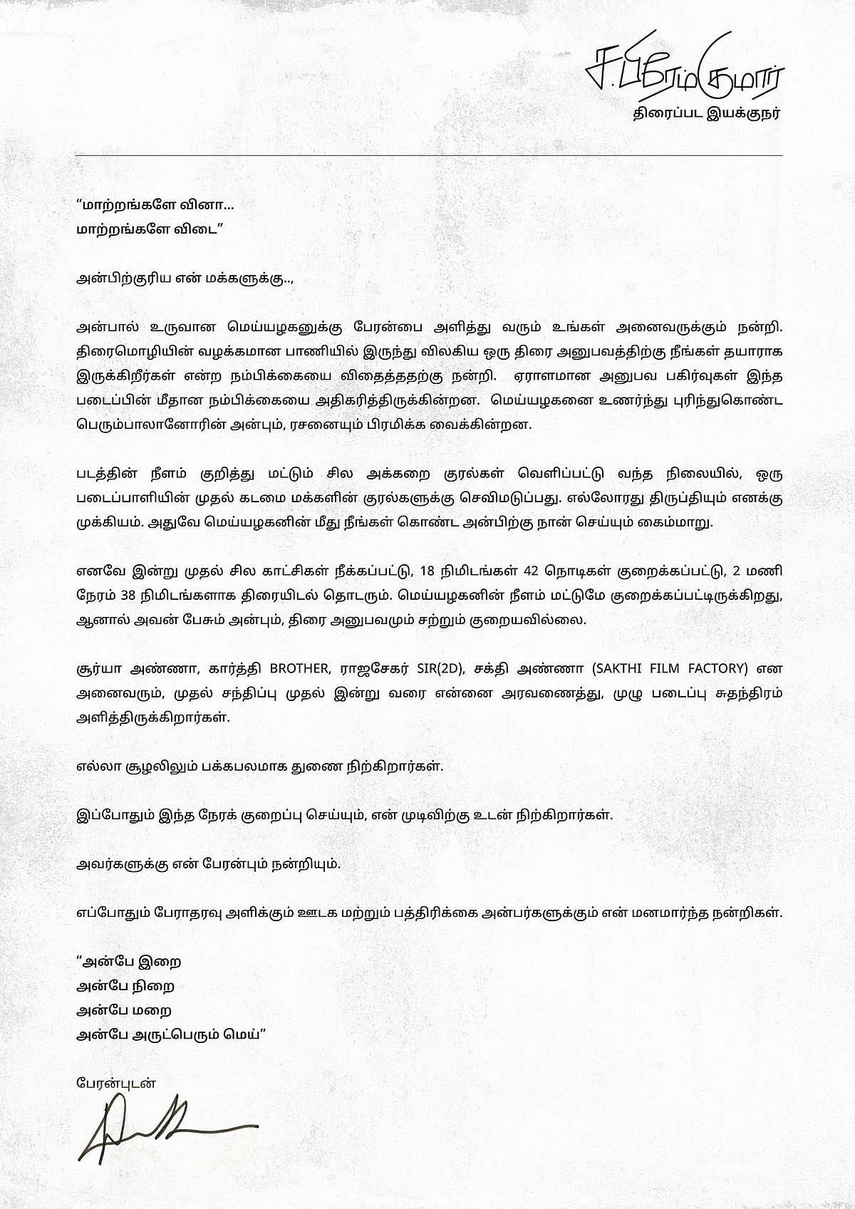 இயக்குநர் ச. பிரேம் குமார் அறிக்கை