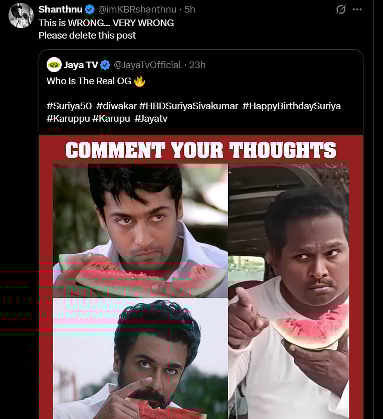 சூர்யா குறித்த மீம் ஒன்றிற்கு ஷாந்தனு கண்டனம் தெரிவித்துள்ளார்...