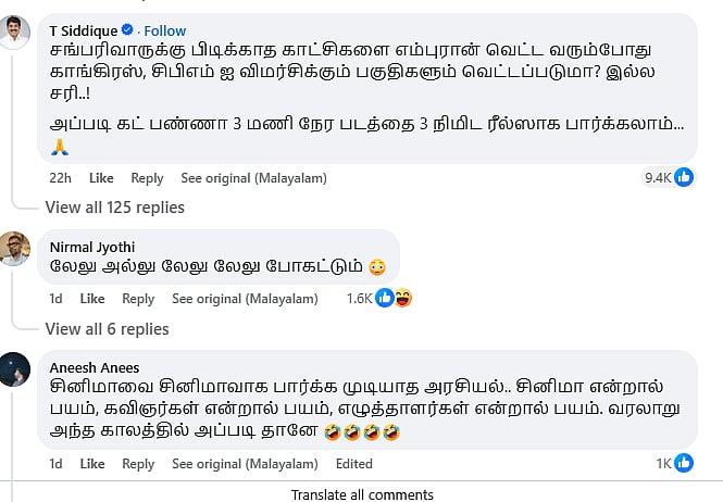 இப்படிப்பட்ட மலையாளத் திரைப்படங்கள் பான் இந்திய வெளியீடாக மிக அதிகமான திரைகளில் வெளியாகும்போதுதான் பிரச்னைகள் முளைக்கின்றன. அப்படி, எம்புரான் புதிய சர்ச்சையைச் சந்தித்துள்ளது. படத்தின் ஆரம்ப காட்சியில் இந்து - முஸ்லீம் மதக்கலவரத்தை 2002-ல் நடப்பதுபோல் காட்டுகின்றனர். (குஜராத்தில் மதக்கலவரம் நடந்த ஆண்டு) அக்காட்சியில் வலதுசாரி அமைப்புகளிடமிருந்து தப்பிக்கும் இஸ்லாமியர்களுக்கு ஒரு ஹிந்து செல்வந்தர் தன் இல்லத்தில் அடைக்கலம் கொடுப்பதுடன் யாரும் உங்களை ஒன்றும் செய்யமாட்டார்கள், உங்கள் பாதுகாப்புக்கு நான் பொறுப்பு என்கிறார்.