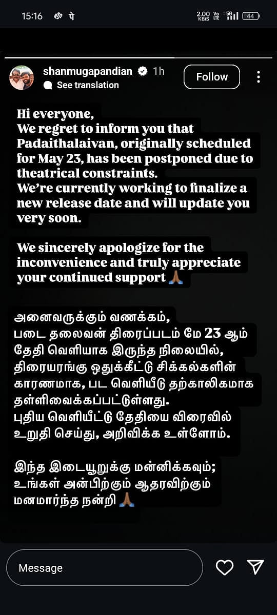 ஆனால், போதிய திரைகள் கிடைக்காததால் இப்படத்தின் வெளியீட்டுத் தேதி ஒத்திவைப்பதாகவும் விரைவில் புதிய தேதி அறிவிக்கப்படும் என சண்முக பாண்டியன் தெரிவித்துள்ளார்.