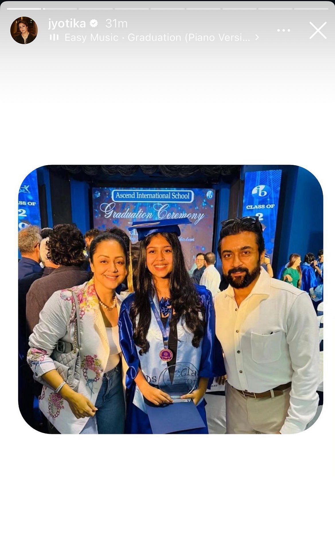 இதன் பட்டமளிப்பு விழாவில் குடும்பத்தினருடன் எடுத்த புகைப்படங்களை நடிகை ஜோதிகா தனது இன்ஸ்டாகிராமில் பகிர்ந்துள்ளார்.